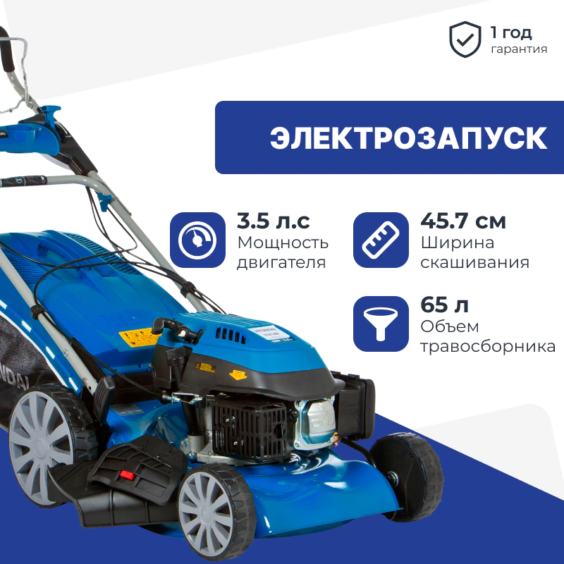 Надежный двигатель Hyundai ICV145 мощностью 3,8 л.с. обеспечивает эффективное скашивание даже густой, высокой или мокрой травы.