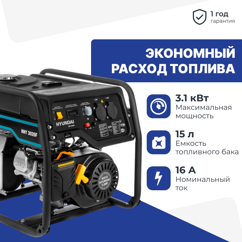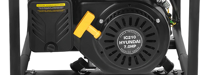 Генератор Hyundai HHY 3020F оснащен одноцилиндровым четырехтактным двигателем с выходной мощностью 7 л.с. Запуск мотора осуществляется ручным стартером. Объема бензинового бака 15 л хватает на 15 часов работы электростанции при нагрузке 50%. Генератор с глушителем отличается тихой работой – уровень шума на удалении 7 м не превышает 69 Дб, что сопоставимо с громким разговором.