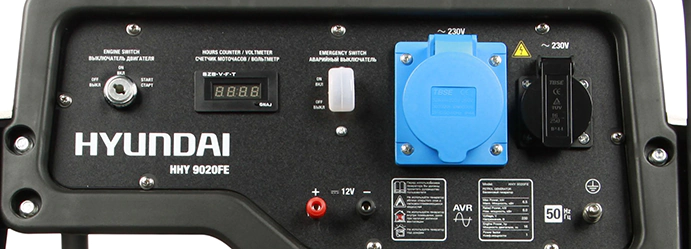 Бензиновый генератор Hyundai служит источником питания для любых однофазных приборов, в том числе, с высокими пусковыми токами. Для подключения предусмотрены две розетки 220 В: одна стандартная, на 16 А, для техники мощностью до 3 кВт, и одна силовая, на 32 А, для потребителей до 6 кВт. Через выход 12 В заряжают аккумуляторы и запитывают другое оборудование соответствующего вольтажа.