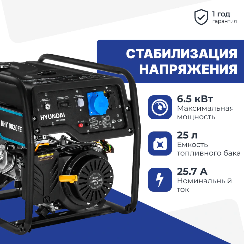 Бензиновый генератор Hyundai HHY 9020FE подойдет в качестве запасного источника энергии для загородного дома, дачи, мастерской или стройплощадки. Благодаря высокой мощности электростанция обеспечивает электричеством сразу несколько потребителей, в сумме до 6,5 кВт. С ней вы организуете бесперебойную работу бытовой техники, осветительных приборов или электроинструментов при отсутствии доступа к основной сети.