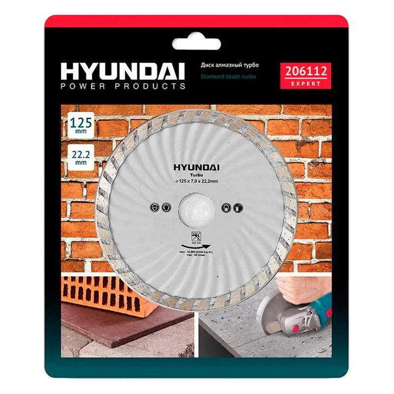 Сухой рез. Диск для болгарки Hyundaiимеет малые компенсационные прорези на кромке и волнообразные выемки - не требует водяного охлаждения во время работы.