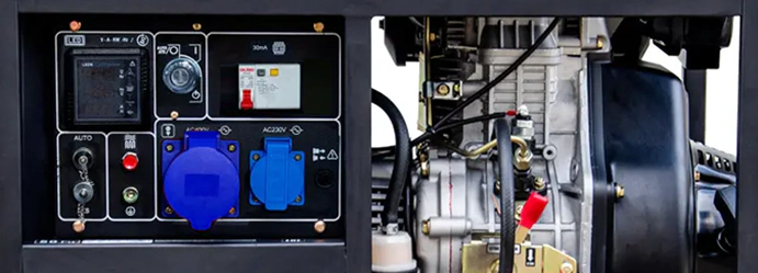 Для подключения потребителей на панели управления расположены две розетки 220 В: 16 А и силовая 32 А. Вы можете задействовать одну выход или сразу обе. Выход постоянного тока напряжением 12 В предназначен для подключения автомобильного аккумулятора. С индикатором уровня топлива вы не пропустите время заправки.