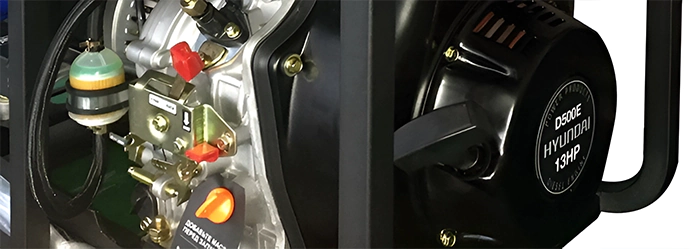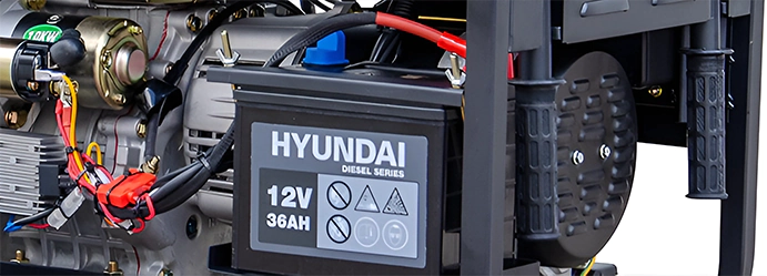 Мотор дизельного генератора Hyundai заводится одним движением руки с помощью электростартера. Ручной стартер с пусковым тросиком пригодится, если разрядится аккумулятор электростартера. Встроенный датчик масла защищает от «сухого хода». Двигатель не запустится или прекратит работу при недостаточном количестве смазки в картере.
