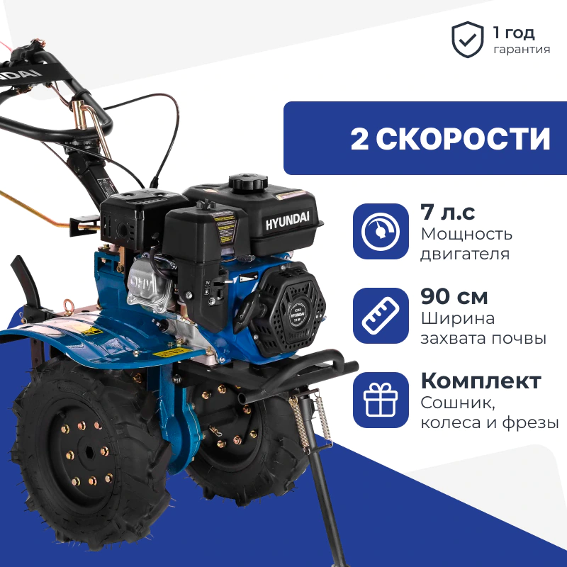 Бензиновый мотоблок Hyundai T 1300 с шириной обработки 90 см предназначен для работы на участках площадью 300 м². Функциональные возможности напрямую зависят от установленного навесного оборудования. Например, можно дополнительно приобрести газонокосилку для стрижки травы летом или снежный отвал, чтобы убирать сугробы зимой. Культиватор подойдет как дачникам, так и фермерам для небольшого сельского хозяйства.
