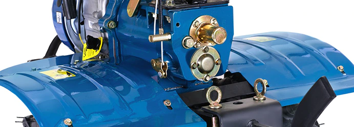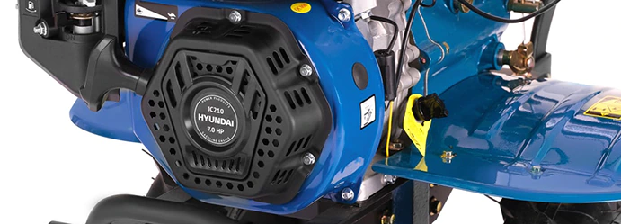 Мотоблок оснащен надежным фирменным двигателем IC210 с верхним расположением клапанов и ресурсом свыше 1500 моточасов. Мощность 7 л.с., а также прочные саблевидные фрезы позволяют справляться даже с плотной почвой и целиной. Регулировать глубину вспашки можно опуская или поднимая сошник. Максимум составляет 30 см.