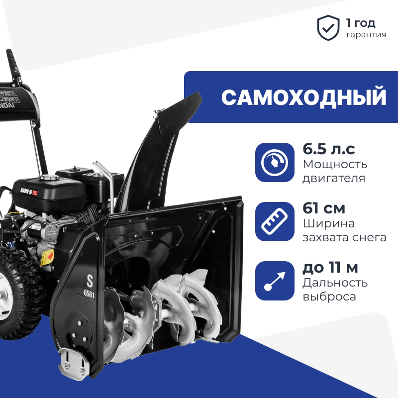 Снегоуборочная машина Hyundai S 6561 с многоступенчатой коробкой передач пригодится всем, кому необходимо быстро справиться с последствиями снегопада. Со снегоуборщиком, оборудованным двигателем мощностью 6,5 л.с., вы расчистите участок площадью 2000 м² на одной заправке бензобака.