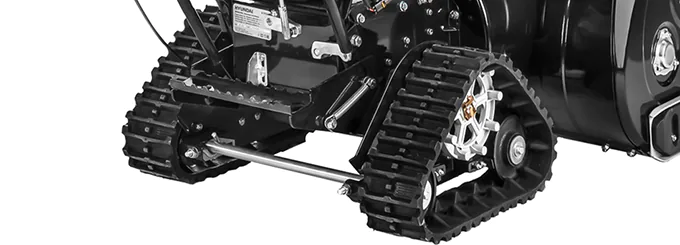 Гусеницы позволяют не буксовать в снегу и на льду, обеспечивают устойчивость снегоуборочной машины на склонах и неровных поверхностях. Для поворота в нужную сторону предусмотрена блокировка дифференциала. Для этого достаточно просто зажать курок на рукоятке с соответствующей стороны.
